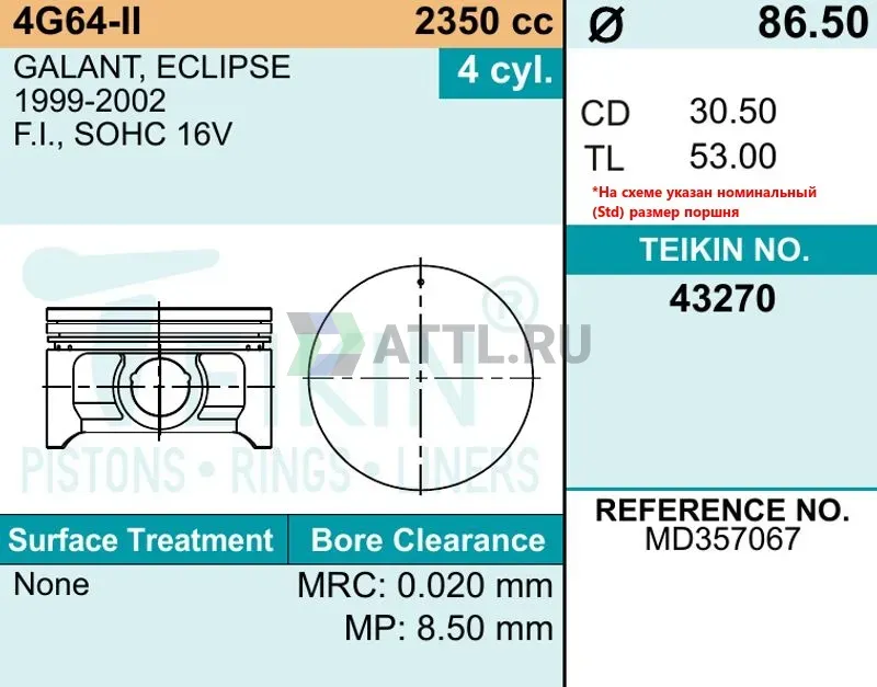 Диаметр поршня STD86.50