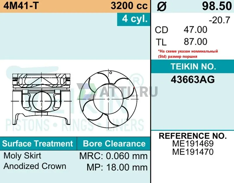 Комплект поршней 4M41 усиленный+охлаждение d98,5+0.50 2,5FK-1,5-3