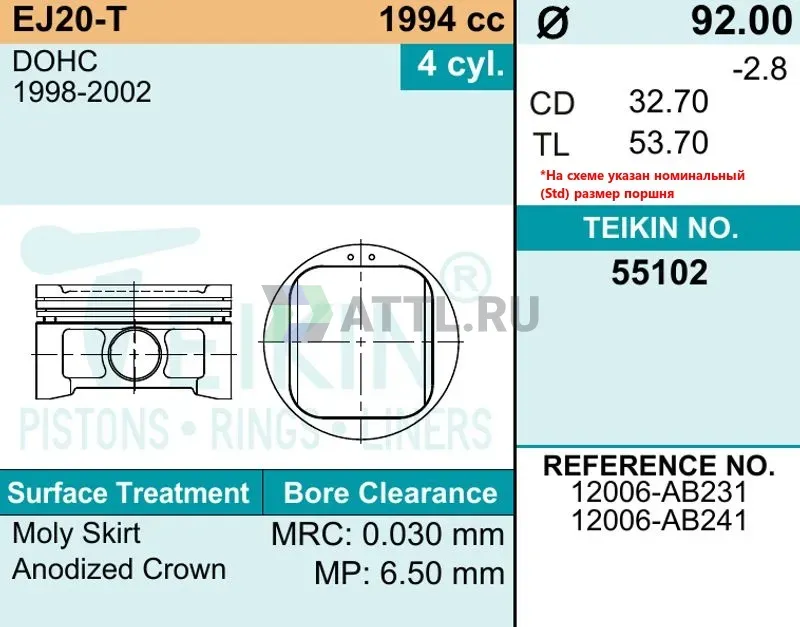 Комплект поршней EJ20-T d92 STD 1,2-1,2-2,5