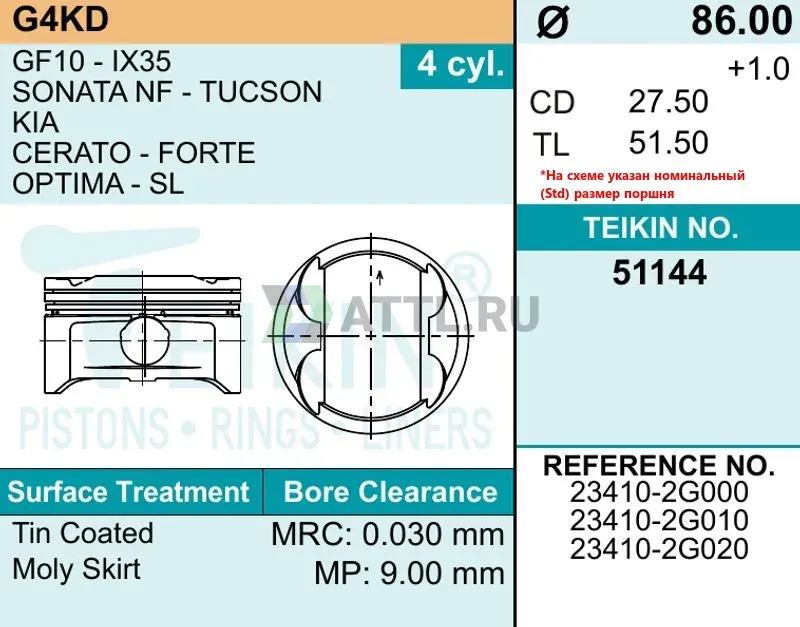 Комплект поршней G4KD d86 STD 1,2-1,2-2