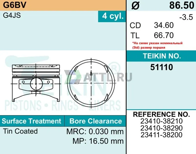 Диаметр поршня STD86.50