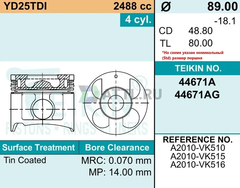 Диаметр поршня STD89.00